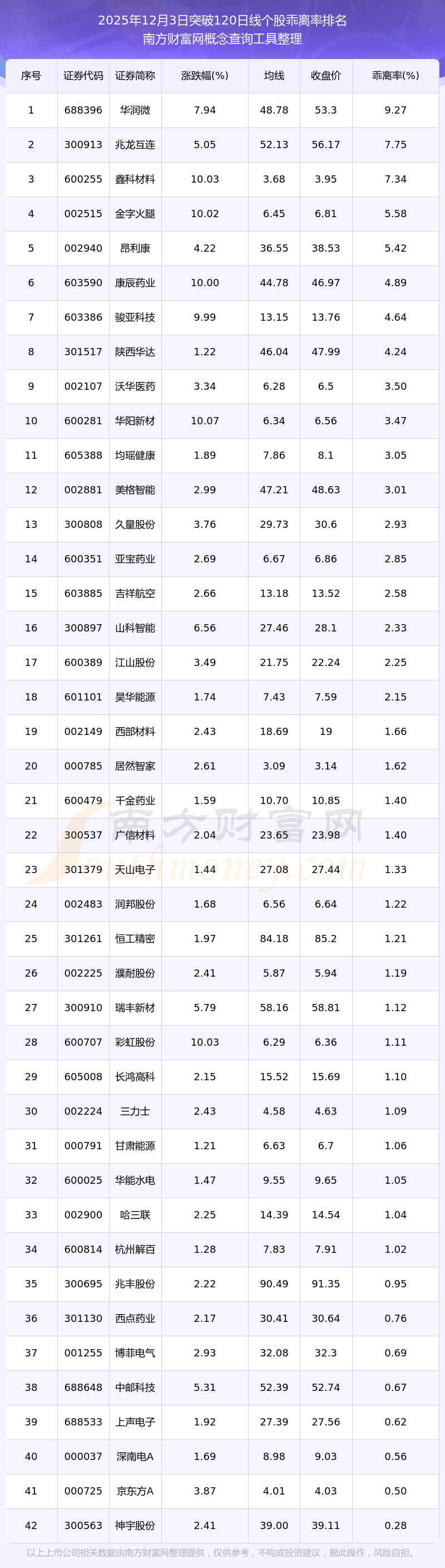 根据南方财富网概念查询工具数据统计,截止2025年12月3日收盘,共有42只个股收盘价向上突破了半年线,其中乖离率较大的个股有华润微、兆龙互连、鑫科材料、金字火腿、昂利康等,乖离率分别为9.27%、7.75%、7.34%、5.58%、5.42%。