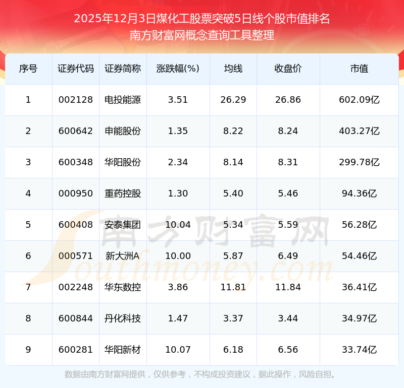 根据南方财富网概念查询工具数据统计,截止2025年12月3日收盘,煤化工股票共有9只个股收盘价向上突破了5日线。其中市值较大的个股有电投能源、申能股份、华阳股份等,市值分别为602.09亿、403.27亿、299.78亿。