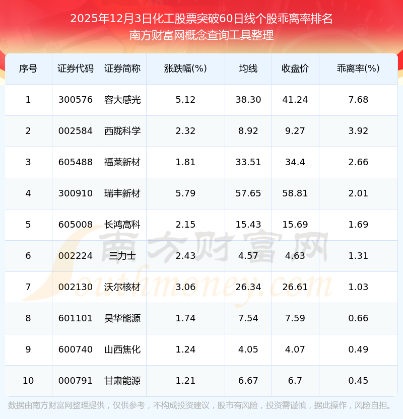 根据南方财富网概念查询工具数据统计,截止2025年12月3日收盘,化工股票共有11只个股收盘价向上突破了60日线。其中乖离率较大的个股有容大感光、西陇科学、福莱新材等,乖离率分别为7.68%、3.92%、2.66%。