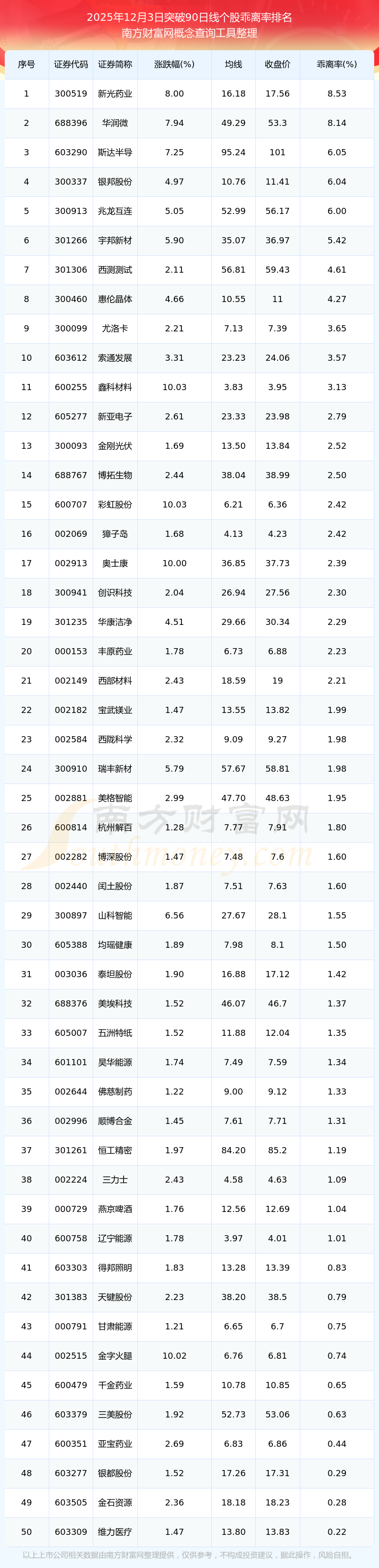 根据南方财富网概念查询工具数据统计,截止2025年12月3日收盘,共有51只个股收盘价向上突破了90日线,其中乖离率较大的个股有新光药业、华润微、斯达半导、银邦股份、兆龙互连等,乖离率分别为8.53%、8.14%、6.05%、6.04%、6.00%。