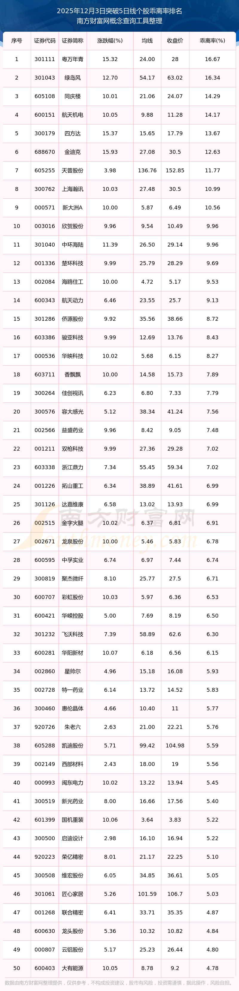 根据南方财富网概念查询工具数据统计,截止2025年12月3日收盘,共有228只个股收盘价向上突破了5日线,其中乖离率较大的个股有粤万年青、绿岛风、同庆楼、航天机电、四方达等,乖离率分别为16.67%、16.34%、14.29%、14.17%、13.67%。