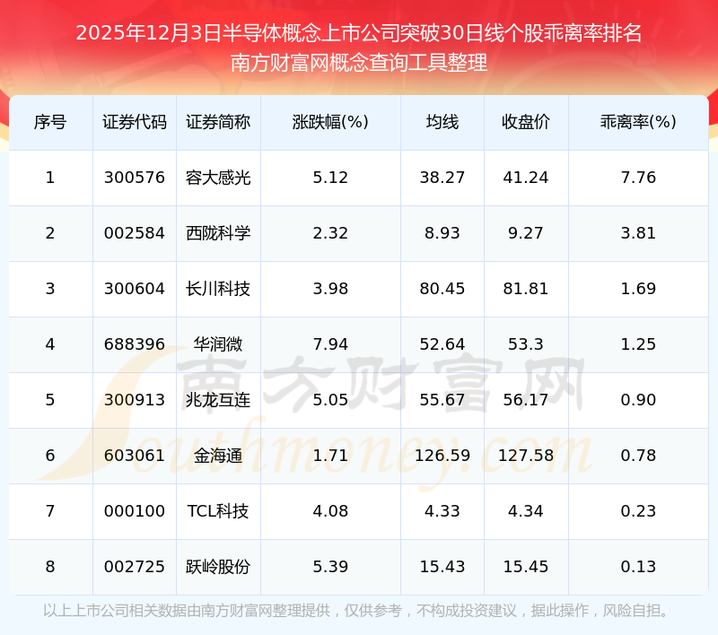 根据南方财富网概念查询工具数据统计,截止2025年12月3日收盘,半导体概念上市公司共有8只个股收盘价向上突破了30日线。其中乖离率较大的个股有容大感光、西陇科学、长川科技等,乖离率分别为7.76%、3.81%、1.69%。