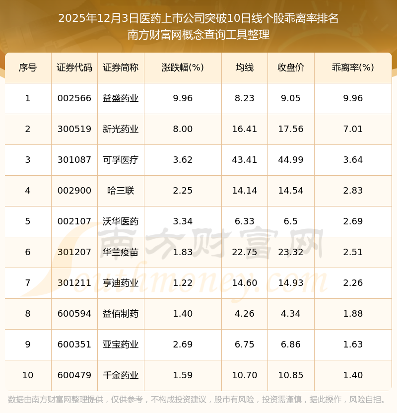 根据南方财富网概念查询工具数据统计,截止2025年12月3日收盘,医药上市公司共有15只个股收盘价向上突破了10日线。其中乖离率较大的个股有益盛药业、新光药业、可孚医疗等,乖离率分别为9.96%、7.01%、3.64%。