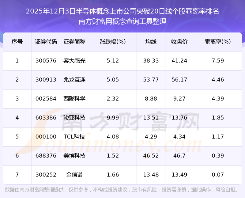 根据南方财富网概念查询工具数据统计,截止2025年12月3日收盘,半导体概念上市公司共有7只个股收盘价向上突破了20日线。其中乖离率较大的个股有容大感光、兆龙互连、西陇科学等,乖离率分别为7.59%、4.46%、4.39%。