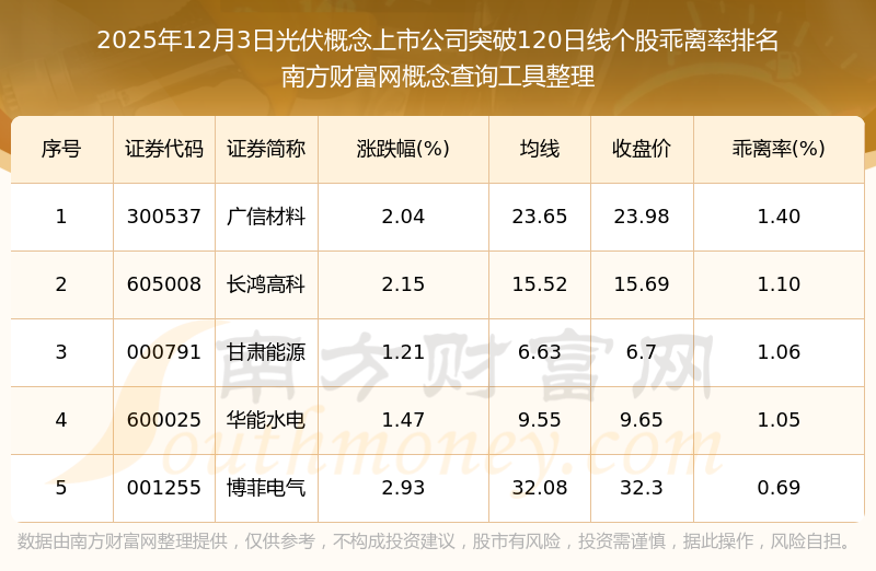 根据南方财富网概念查询工具数据统计,截止2025年12月3日收盘,光伏概念上市公司共有5只个股收盘价向上突破了120日线。其中乖离率较大的个股有广信材料、长鸿高科、甘肃能源等,乖离率分别为1.40%、1.10%、1.06%。