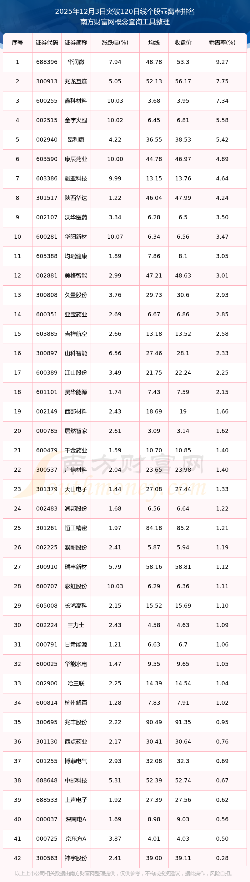 根据南方财富网概念查询工具数据统计,截止2025年12月3日收盘,共有42只个股收盘价向上突破了120日线,其中乖离率较大的个股有华润微、兆龙互连、鑫科材料、金字火腿、昂利康等,乖离率分别为9.27%、7.75%、7.34%、5.58%、5.42%。