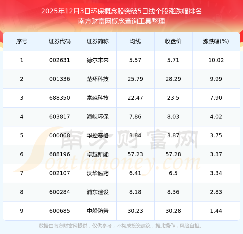 根据南方财富网概念查询工具数据统计,截止2025年12月3日收盘,环保概念股共有9只个股收盘价向上突破了5日线。其中涨幅较大的个股有德尔未来、楚环科技、富淼科技等,涨幅分别为10.02%、9.99%、7.90%。