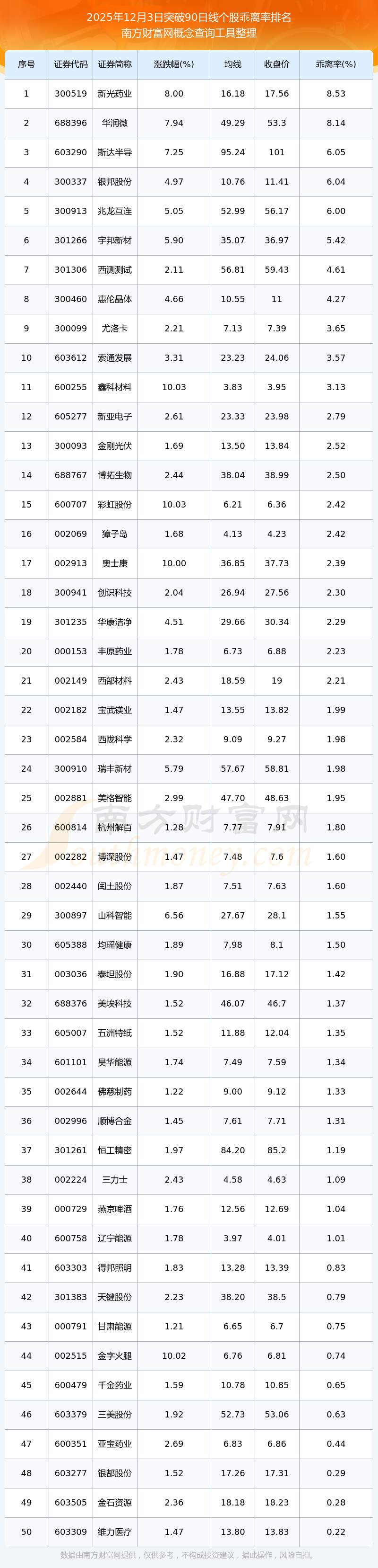 根据南方财富网概念查询工具数据统计,截止2025年12月3日收盘,共有51只个股收盘价向上突破了90日线,其中乖离率较大的个股有新光药业、华润微、斯达半导、银邦股份、兆龙互连等,乖离率分别为8.53%、8.14%、6.05%、6.04%、6.00%。