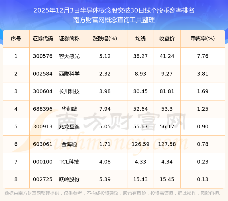 根据南方财富网概念查询工具数据统计,截止2025年12月3日收盘,半导体概念股共有8只个股收盘价向上突破了30日线。其中乖离率较大的个股有容大感光、西陇科学、长川科技等,乖离率分别为7.76%、3.81%、1.69%。
