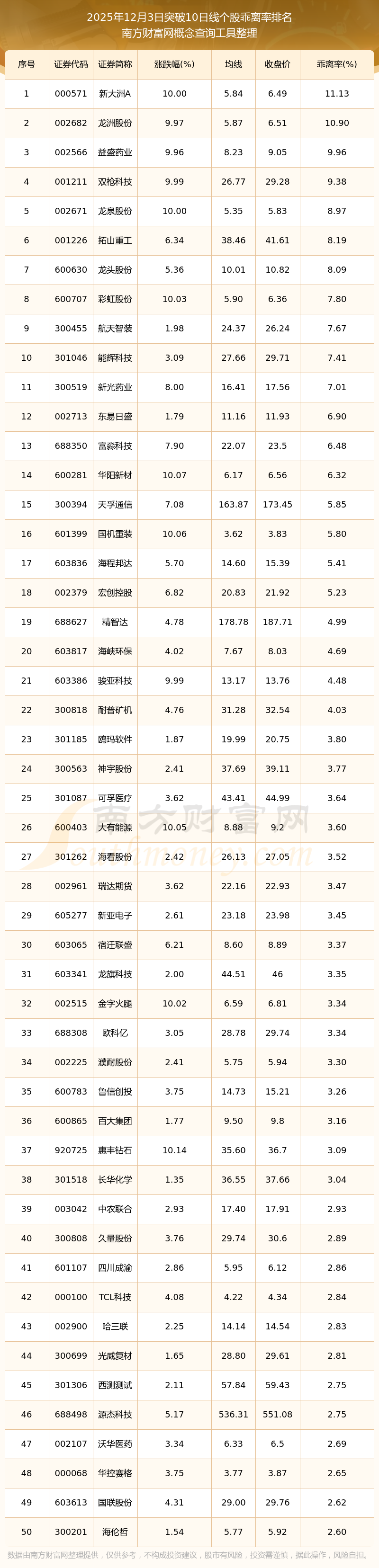 根据南方财富网概念查询工具数据统计,截止2025年12月3日收盘,共有107只个股收盘价向上突破了10日线,其中乖离率较大的个股有新大洲A、龙洲股份、益盛药业、双枪科技、龙泉股份等,乖离率分别为11.13%、10.90%、9.96%、9.38%、8.97%。