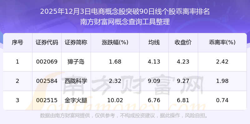 2025年12月3日电商概念股突破90日线个股乖离率排名