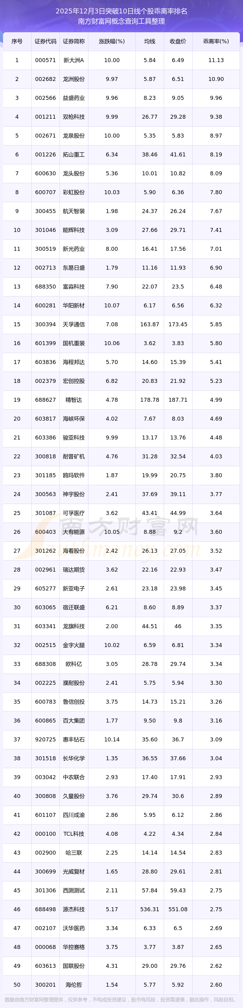 根据南方财富网概念查询工具数据统计,截止2025年12月3日收盘,共有107只个股收盘价向上突破了10日线,其中乖离率较大的个股有新大洲A、龙洲股份、益盛药业、双枪科技、龙泉股份等,乖离率分别为11.13%、10.90%、9.96%、9.38%、8.97%。