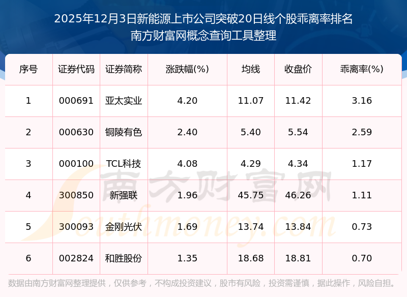 根据南方财富网概念查询工具数据统计,截止2025年12月3日收盘,新能源上市公司共有6只个股收盘价向上突破了20日线。其中乖离率较大的个股有亚太实业、铜陵有色、TCL科技等,乖离率分别为3.16%、2.59%、1.17%。
