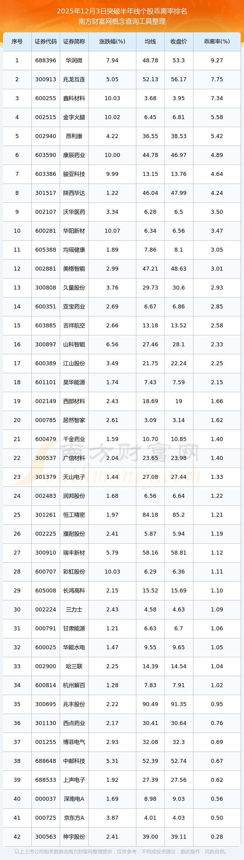 根据南方财富网概念查询工具数据统计,截止2025年12月3日收盘,共有42只个股收盘价向上突破了半年线,其中乖离率较大的个股有华润微、兆龙互连、鑫科材料、金字火腿、昂利康等,乖离率分别为9.27%、7.75%、7.34%、5.58%、5.42%。
