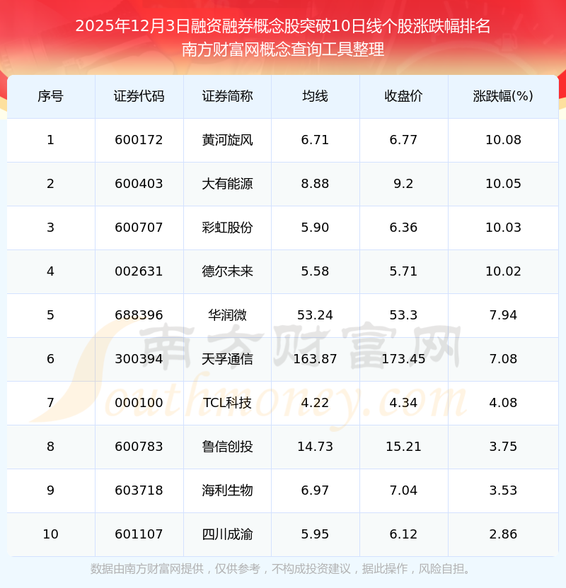 2025年12月3日融资融券概念股突破10日线个股涨跌幅排名
