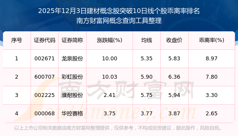 根据南方财富网概念查询工具数据统计,截止2025年12月3日收盘,建材概念股共有4只个股收盘价向上突破了10日线。其中乖离率较大的个股有龙泉股份、彩虹股份、濮耐股份等,乖离率分别为8.97%、7.80%、3.30%。