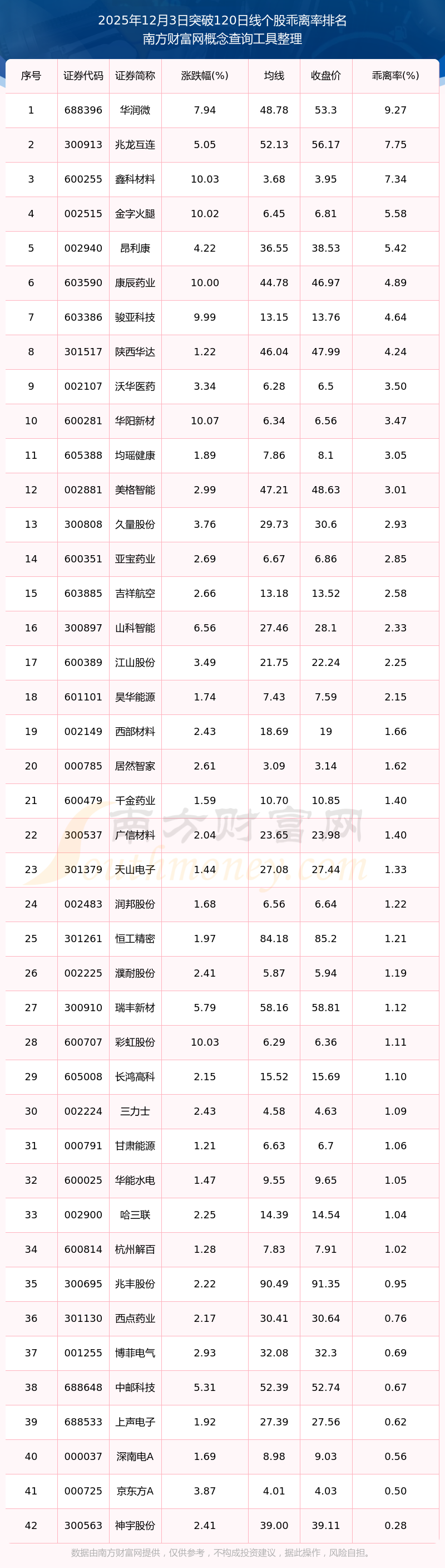 根据南方财富网概念查询工具数据统计,截止2025年12月3日收盘,共有42只个股收盘价向上突破了半年线,其中乖离率较大的个股有华润微、兆龙互连、鑫科材料、金字火腿、昂利康等,乖离率分别为9.27%、7.75%、7.34%、5.58%、5.42%。
