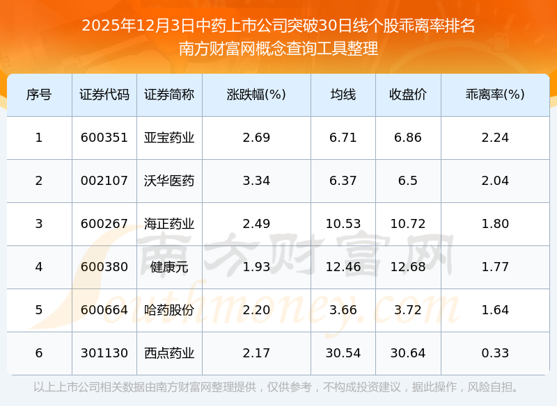 2025年12月3日中药上市公司突破30日线个股乖离率排名