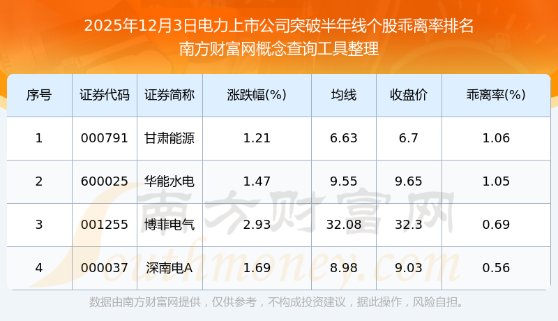 2025年12月3日电力上市公司突破半年线个股乖离率排名