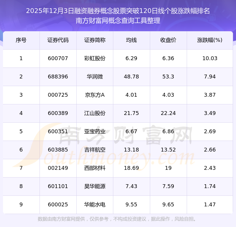 根据南方财富网概念查询工具数据统计,截止2025年12月3日收盘,融资融券概念股票共有9只个股收盘价向上突破了120日线。其中涨幅较大的个股有彩虹股份、华润微、京东方A等,涨幅分别为10.03%、7.94%、3.87%。