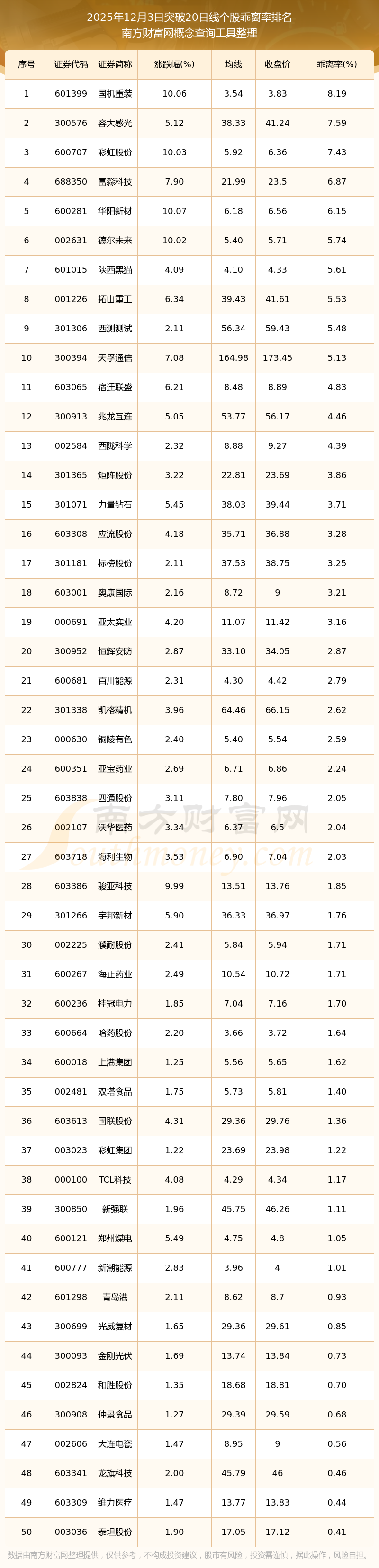 根据南方财富网概念查询工具数据统计,截止2025年12月3日收盘,共有57只个股收盘价向上突破了20日线,其中乖离率较大的个股有国机重装、容大感光、彩虹股份、富淼科技、华阳新材等,乖离率分别为8.19%、7.59%、7.43%、6.87%、6.15%。