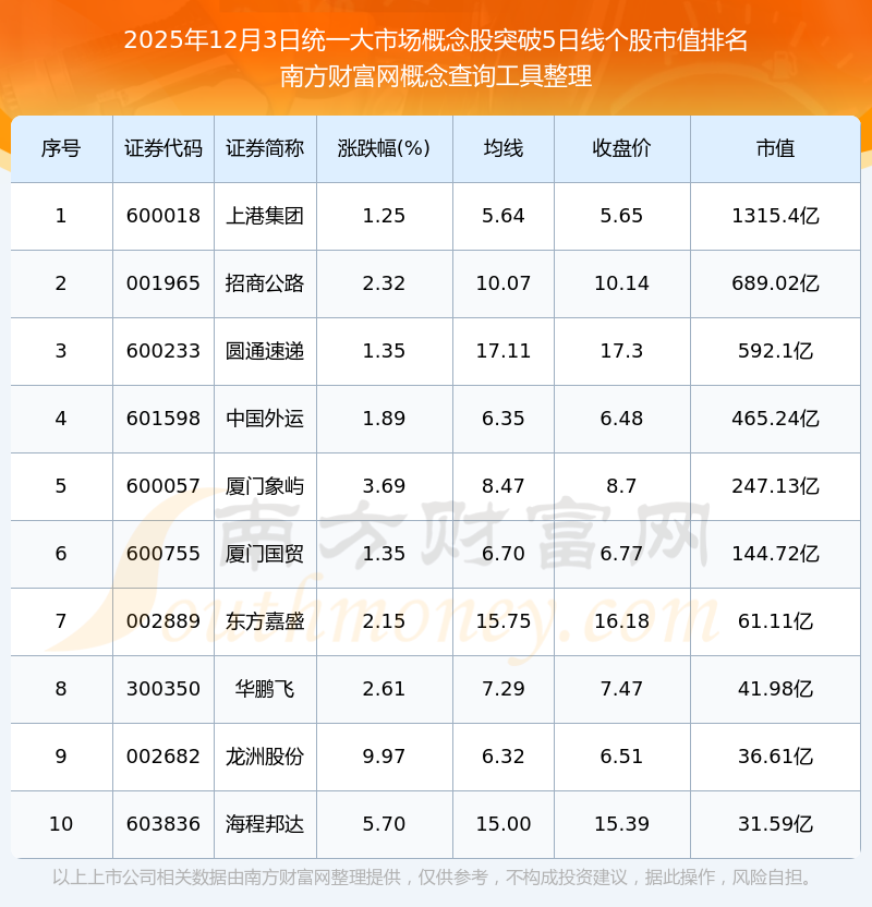 根据南方财富网概念查询工具数据统计,截止2025年12月3日收盘,统一大市场概念股共有10只个股收盘价向上突破了5日线。其中市值较大的个股有上港集团、招商公路、圆通速递等,市值分别为1317.73亿、689.02亿、592.1亿。