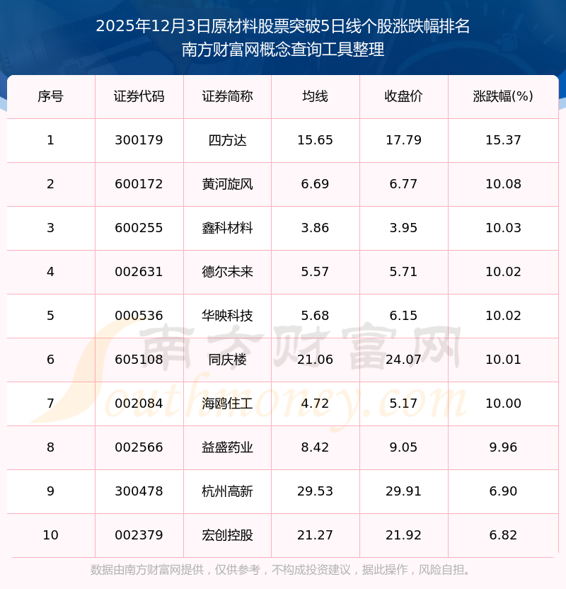 根据南方财富网概念查询工具数据统计,截止2025年12月3日收盘,原材料股票共有46只个股收盘价向上突破了5日线。其中涨幅较大的个股有四方达、黄河旋风、鑫科材料等,涨幅分别为15.37%、10.08%、10.03%。