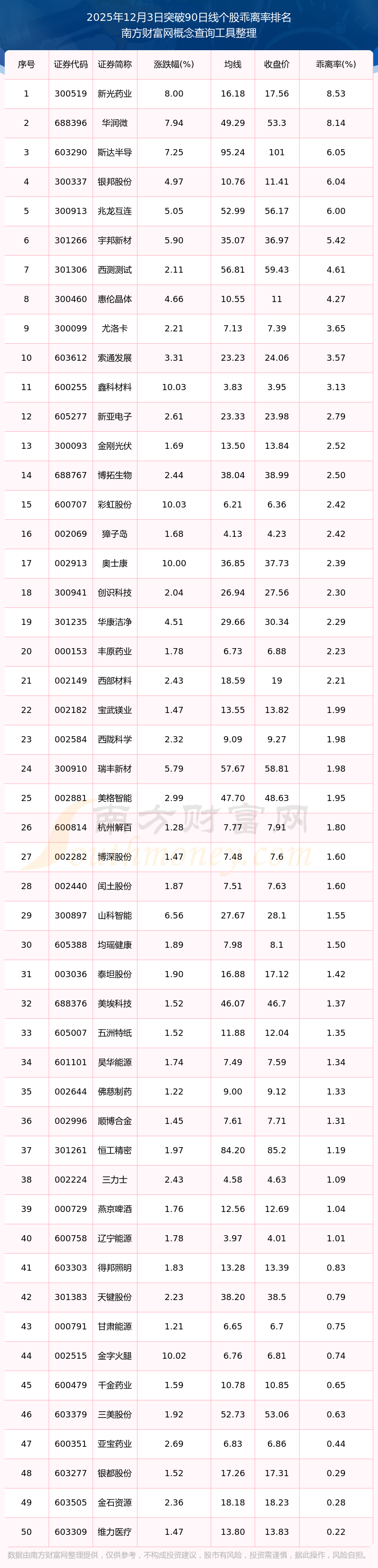 根据南方财富网概念查询工具数据统计,截止2025年12月3日收盘,共有51只个股收盘价向上突破了90日线,其中乖离率较大的个股有新光药业、华润微、斯达半导、银邦股份、兆龙互连等,乖离率分别为8.53%、8.14%、6.05%、6.04%、6.00%。