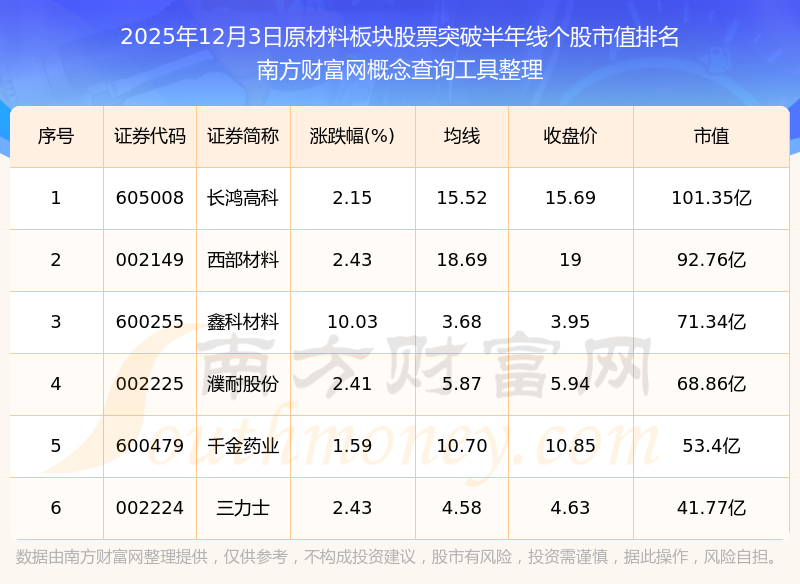 2025年12月3日原材料板块股票突破半年线个股市值排名