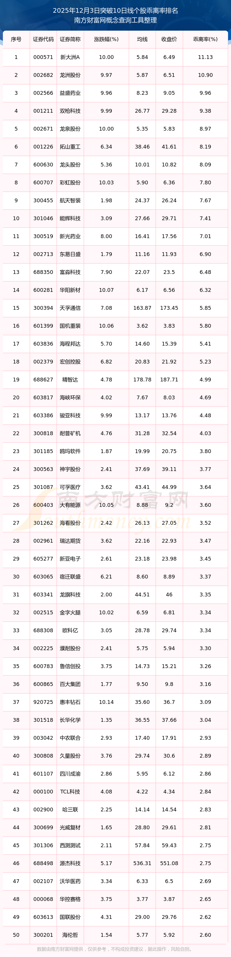 根据南方财富网概念查询工具数据统计,截止2025年12月3日收盘,共有107只个股收盘价向上突破了10日线,其中乖离率较大的个股有新大洲A、龙洲股份、益盛药业、双枪科技、龙泉股份等,乖离率分别为11.13%、10.90%、9.96%、9.38%、8.97%。