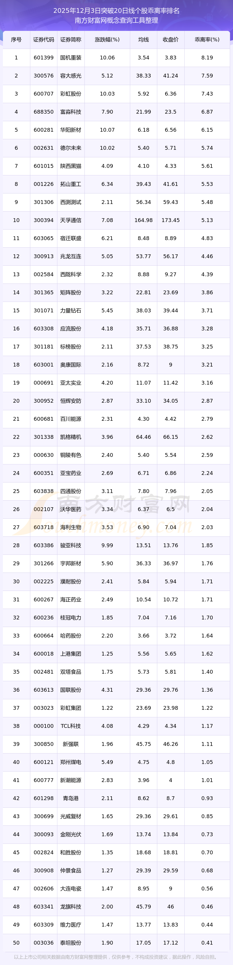 2025年12月3日突破20日线个股乖离率排名
