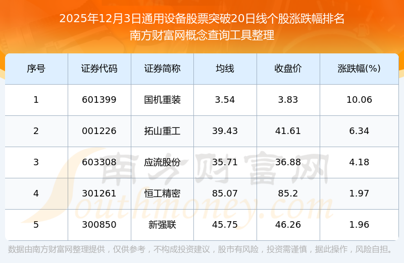 2025年12月3日通用设备股票突破20日线个股涨跌幅排名