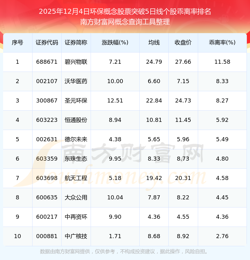 2025年12月4日环保概念股票突破5日线个股乖离率排名