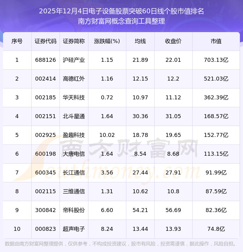 根据南方财富网概念查询工具数据统计,截止2025年12月4日收盘,电子设备股票共有14只个股收盘价向上突破了60日线。其中市值较大的个股有沪硅产业、高德红外、华天科技等,市值分别为703.13亿、521.03亿、362.39亿。