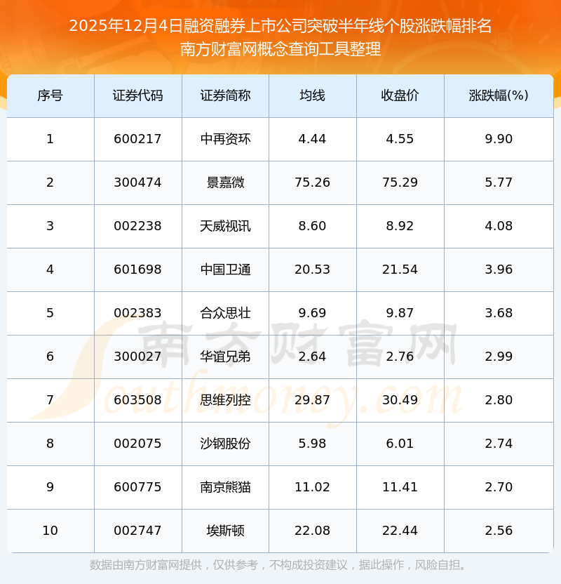 2025年12月4日融资融券上市公司突破半年线个股涨跌幅排名