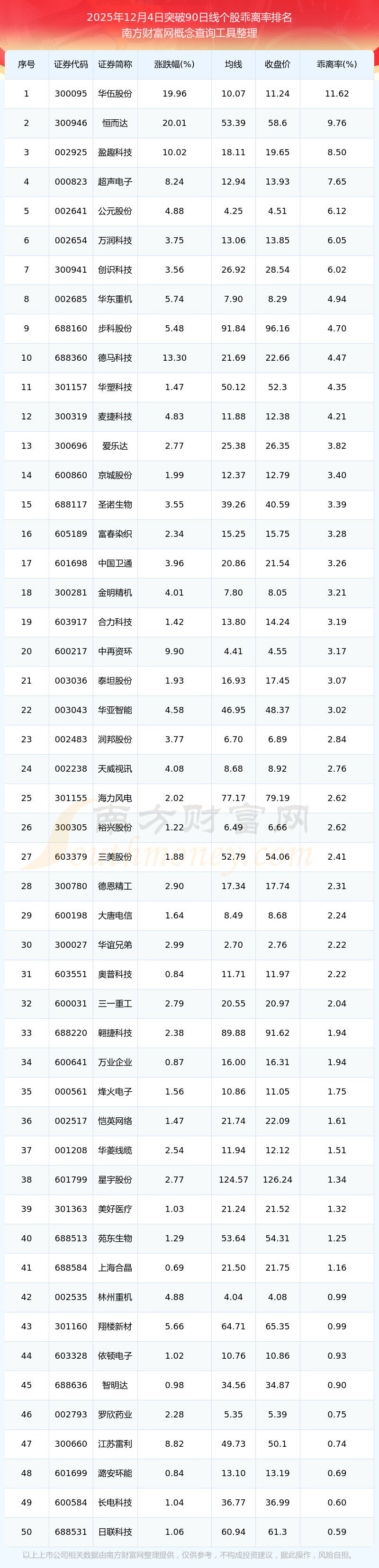 根据南方财富网概念查询工具数据统计,截止2025年12月4日收盘,共有66只个股收盘价向上突破了90日线,其中乖离率较大的个股有华伍股份、恒而达、盈趣科技、超声电子、公元股份等,乖离率分别为11.62%、9.76%、8.50%、7.65%、6.12%。