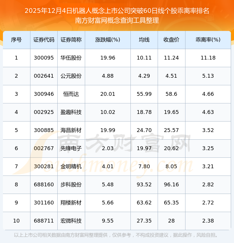 根据南方财富网概念查询工具数据统计,截止2025年12月4日收盘,机器人概念上市公司共有27只个股收盘价向上突破了60日线。其中乖离率较大的个股有华伍股份、公元股份、恒而达等,乖离率分别为11.18%、5.13%、4.66%。