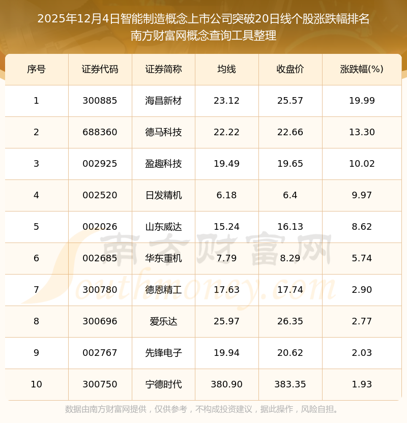 根据南方财富网概念查询工具数据统计,截止2025年12月4日收盘,智能制造概念上市公司共有16只个股收盘价向上突破了20日线。其中涨幅较大的个股有海昌新材、德马科技、盈趣科技等,涨幅分别为19.99%、13.30%、10.02%。