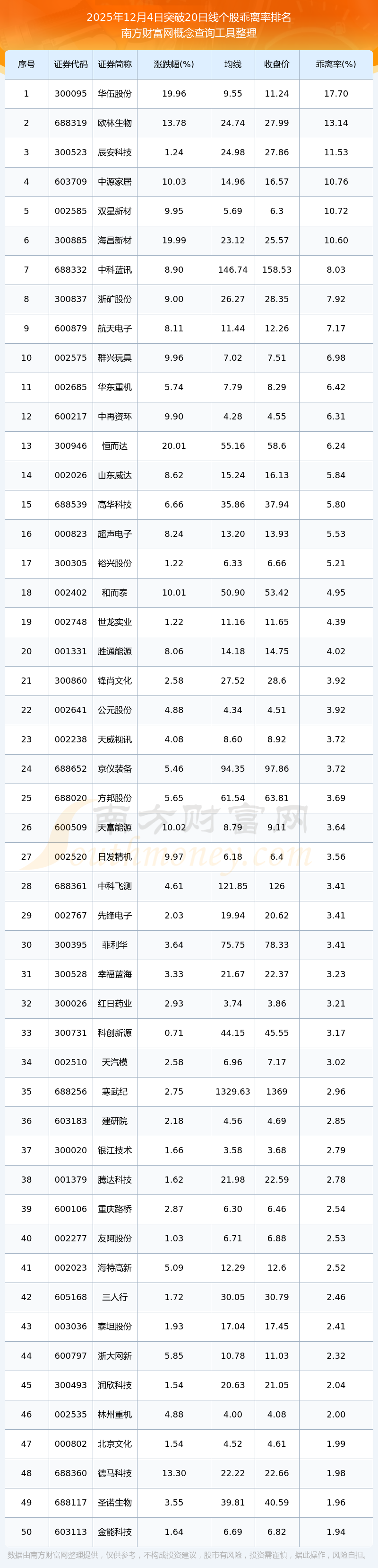 根据南方财富网概念查询工具数据统计,截止2025年12月4日收盘,共有99只个股收盘价向上突破了20日线,其中乖离率较大的个股有华伍股份、欧林生物、辰安科技、中源家居、双星新材等,乖离率分别为17.70%、13.14%、11.53%、10.76%、10.72%。