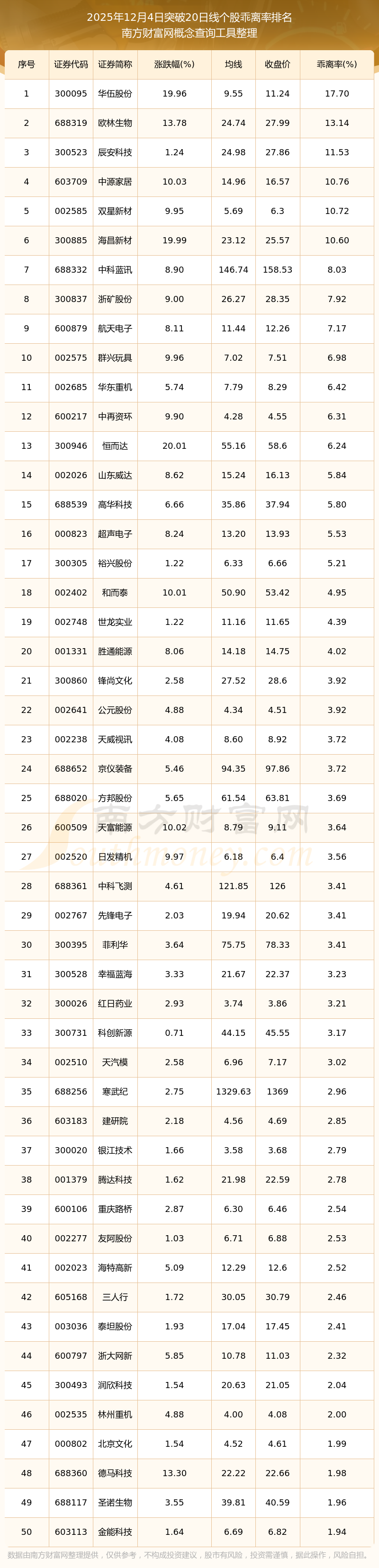 根据南方财富网概念查询工具数据统计,截止2025年12月4日收盘,共有99只个股收盘价向上突破了20日线,其中乖离率较大的个股有华伍股份、欧林生物、辰安科技、中源家居、双星新材等,乖离率分别为17.70%、13.14%、11.53%、10.76%、10.72%。