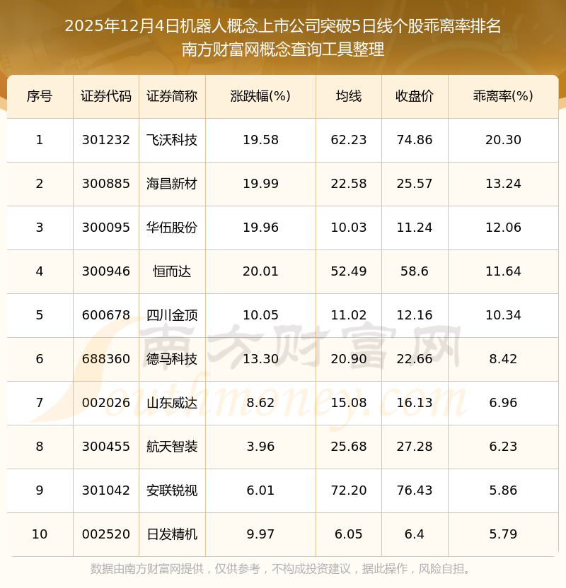 2025年12月4日机器人概念上市公司突破5日线个股乖离率排名