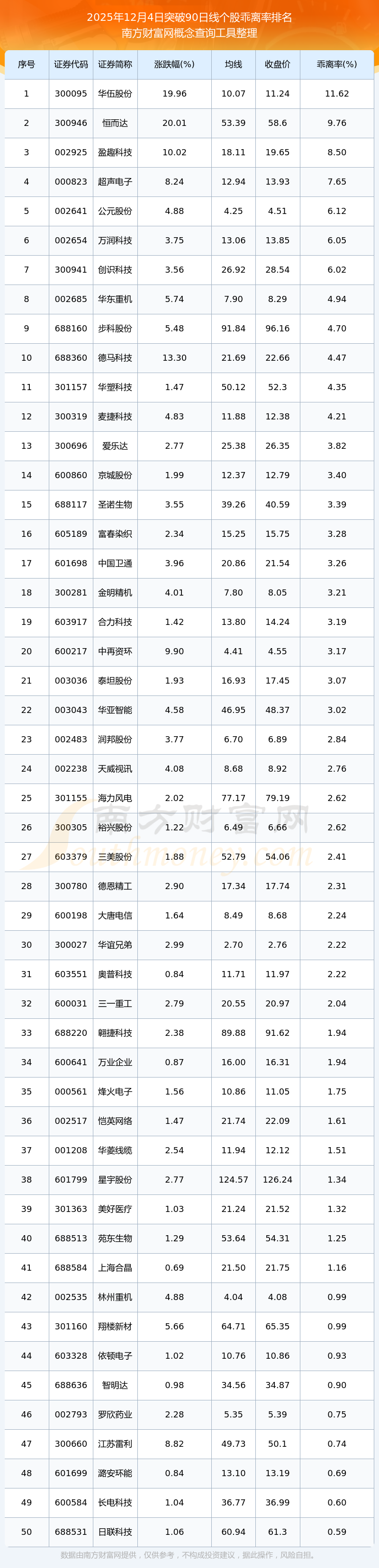 根据南方财富网概念查询工具数据统计,截止2025年12月4日收盘,共有66只个股收盘价向上突破了90日线,其中乖离率较大的个股有华伍股份、恒而达、盈趣科技、超声电子、公元股份等,乖离率分别为11.62%、9.76%、8.50%、7.65%、6.12%。