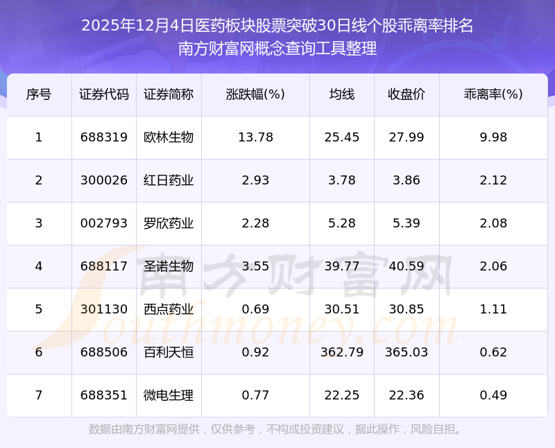 根据南方财富网概念查询工具数据统计,截止2025年12月4日收盘,医药板块股票共有7只个股收盘价向上突破了30日线。其中乖离率较大的个股有欧林生物、红日药业、罗欣药业等,乖离率分别为9.98%、2.12%、2.08%。