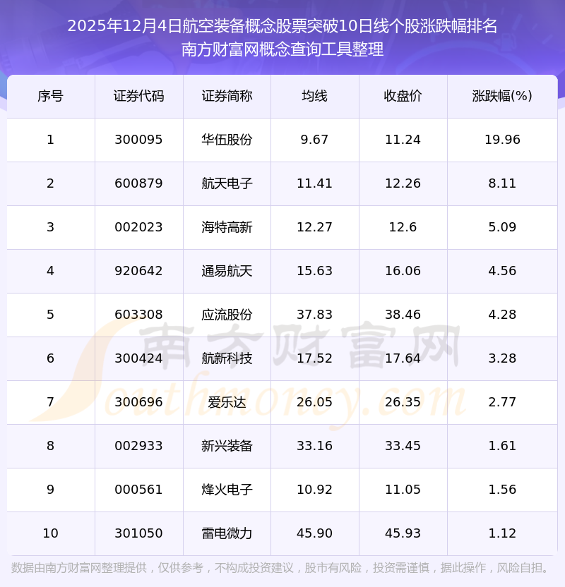 2025年12月4日航空装备概念股票突破10日线个股涨跌幅排名