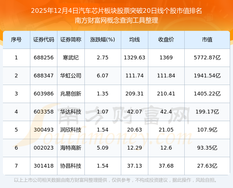 根据南方财富网概念查询工具数据统计,截止2025年12月4日收盘,汽车芯片板块股票共有7只个股收盘价向上突破了20日线。其中市值较大的个股有寒武纪、华虹公司、兆易创新等,市值分别为5772.87亿、1941.54亿、1405.22亿。