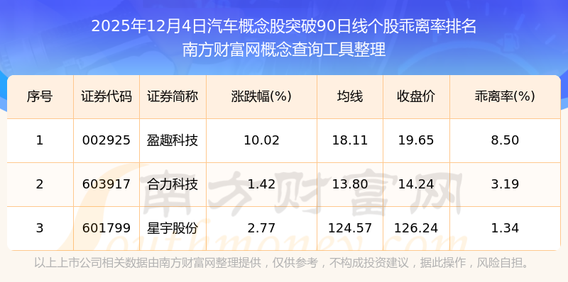 2025年12月4日汽车概念股突破90日线个股乖离率排名