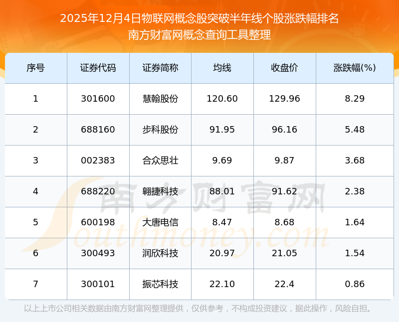 根据南方财富网概念查询工具数据统计,截止2025年12月4日收盘,物联网概念股共有7只个股收盘价向上突破了半年线。其中涨幅较大的个股有慧翰股份、步科股份、合众思壮等,涨幅分别为8.29%、5.48%、3.68%。