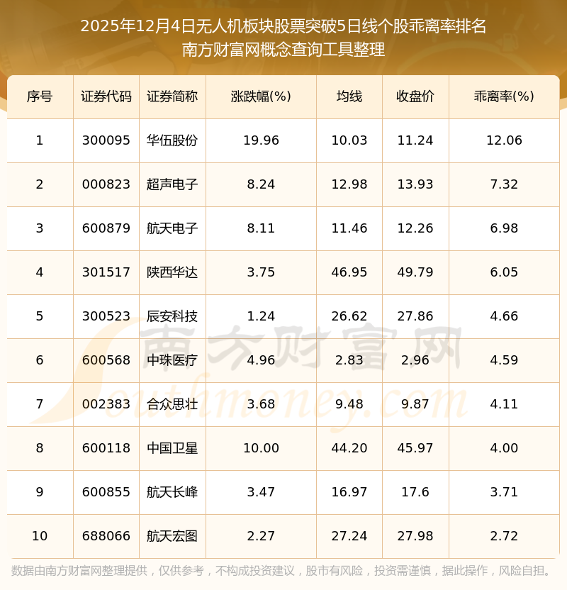 根据南方财富网概念查询工具数据统计,截止2025年12月4日收盘,无人机板块股票共有23只个股收盘价向上突破了5日线。其中乖离率较大的个股有华伍股份、超声电子、航天电子等,乖离率分别为12.06%、7.32%、6.98%。