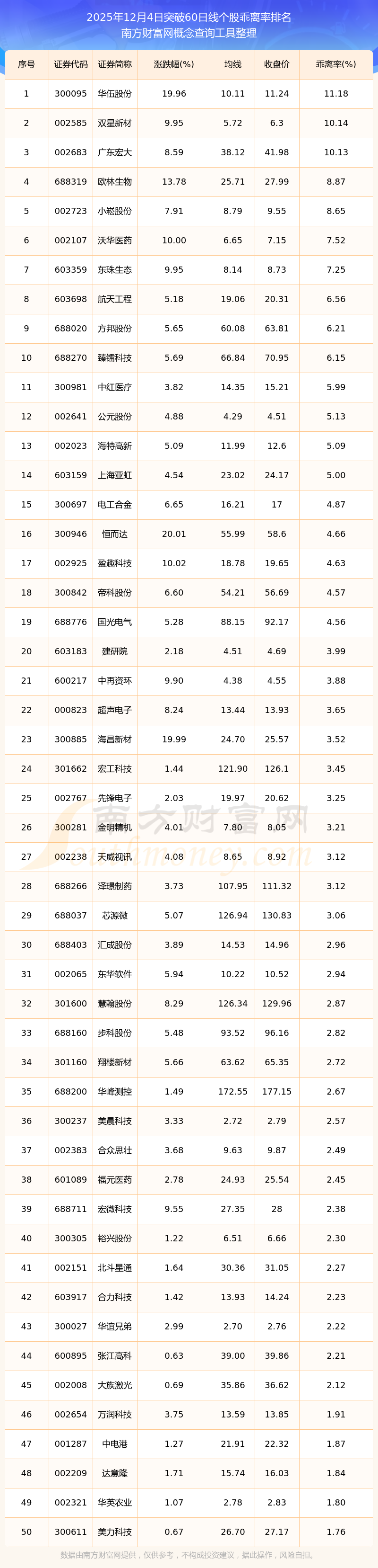 根据南方财富网概念查询工具数据统计,截止2025年12月4日收盘,共有87只个股收盘价向上突破了60日线,其中乖离率较大的个股有华伍股份、双星新材、广东宏大、欧林生物、小崧股份等,乖离率分别为11.18%、10.14%、10.13%、8.87%、8.65%。