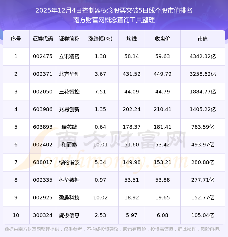 2025年12月4日控制器概念股票突破5日线个股市值排名